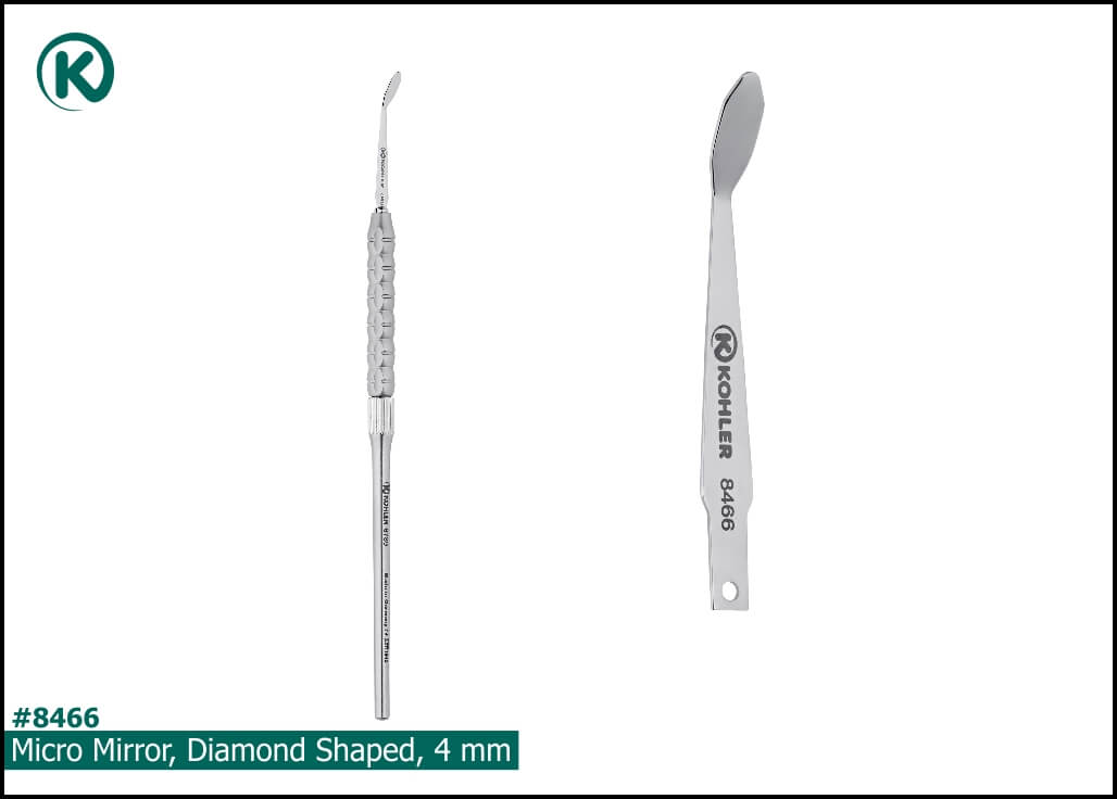 Có ba kích cỡ gương vi phẫu với cán linh hoạt (flexible shaft): Độ rộng 4 mm, 3 mm và 2 mm với hình dạng kim cương (diamond shapes).